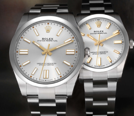 The Oyster Perpetual watch is the essence of Rolex – there is no date, no Cyclops, only pure timing symmetry. The silver dial with golden markings on the sun rays brings a retro and cool atmosphere to these Rolex couple watches, giving them an incredible sense of modernity in 2026. This is a set for a couple who love medieval modern furniture and capsule wardrobes.